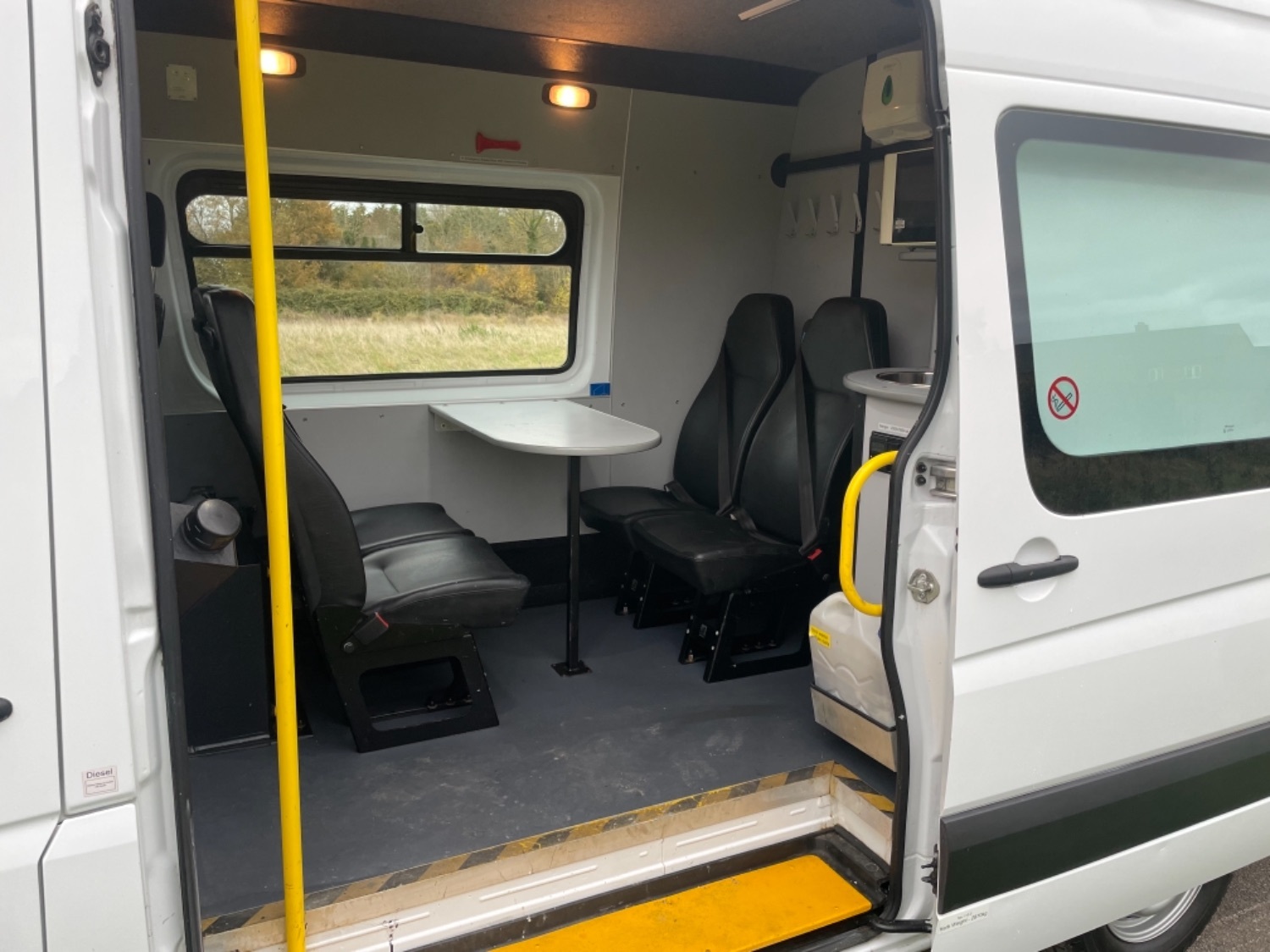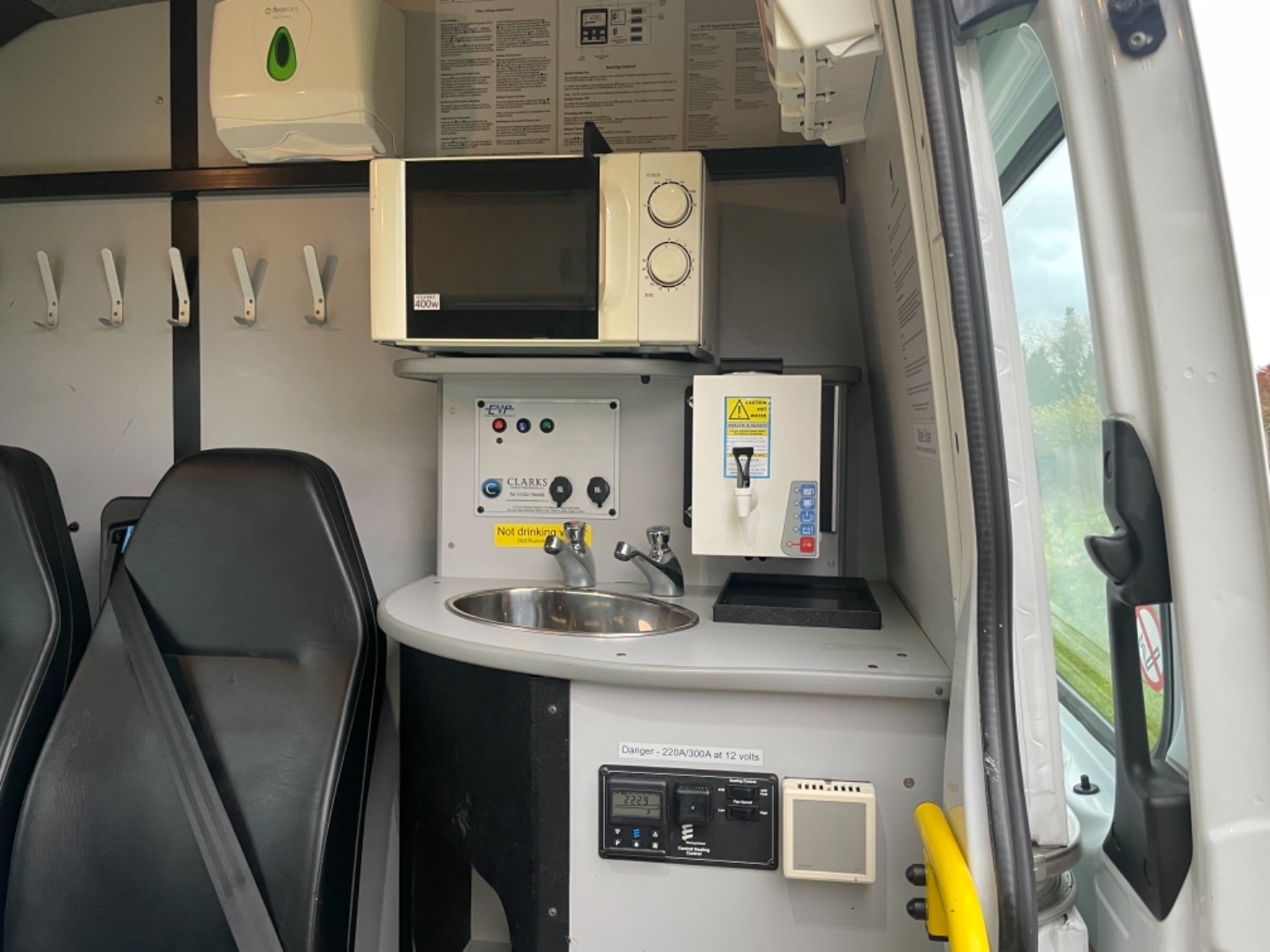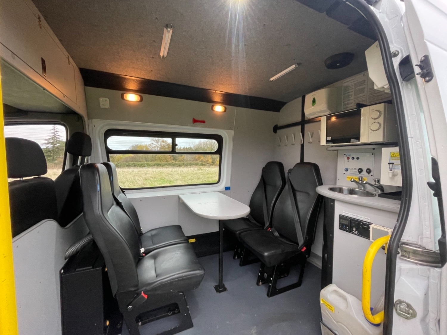 Great Factory Spec - 7 Seats, Remote Central Locking, Trip Computer, Steering Wheel Radio Controls, Power Windows, Power Mirrors, AM/FM/CD Radio with USB & Aux In, Bluetooth Telephone Connectivity, Height Adjustable Steering Wheel, Steering Wheel Controls, ABS, ESP, PAS, Drivers & Passengers Airbag, Nearside Side Loading Door, 7 seater welfare crew van, CLARK conversions (stage 2), webasto auxiliary heating system with warranty card and handbooks, thetford cassette toilet c220 series with waste tub, hot water boiler, wash sink in the front area and wash sink in the rear area with waste water cans, hand paper towel dispensers in the front area and the rear area, hand liquid dispensers in the front area and the rear area, 12v microwave, fabric roof with interior led bright white light throughout, fixed table, instrument panel, first aid kit, fire extinguisher, orange flashing beacon